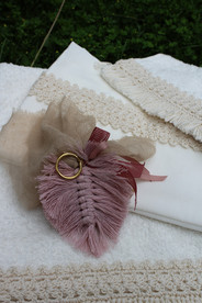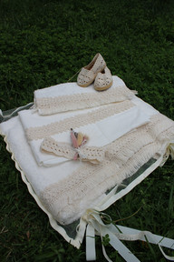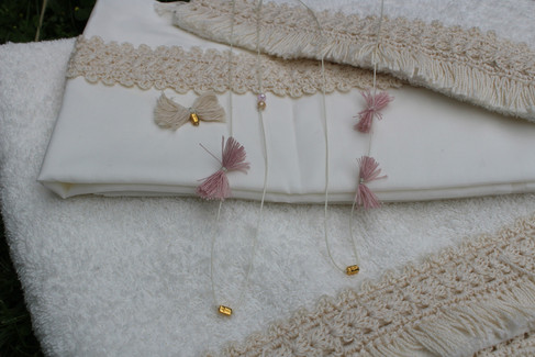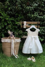 Ολοκληρωμένη βάπτιση για την μικρή Βασιλική με θέμα Boho και pampas. Βαπτιστικό φορεματάκι ιβουάρ από 100% λινό ύφασμα με χειροποίητο πλεκτό μπούστο. Συνοδεύεται από τα αντίστοιχα λαδόπανα με πλεκτές τρέσες και κρόσια. Συμπληρώθηκε με boho καλάθι βάπτισης και λαμπάδα, στολισμένα με λεβάντες, bunny tails και pampas, όλα στο ίδιο ύφος και διακοσμημένα με χειροποίητες πλεκτές τρέσες. Ολοκληρώθηκε με τις μπομπονιέρες, τα μαρτυρικά, τις βαπτιστικές εσπαντρίγιες και τη κορδέλα για τα μαλλιά με pampas, bunny tails και λεβάντες. Όλα χειροποίητα σε εκρού ανοιχτό, dusty pink και μπεζ αποχρώσεις.