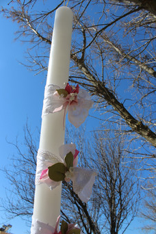 Ολοκληρωμένη βάπτιση για την Ιόλη με θέμα τη βουκαμβίλια. Χειροποίητο βαπτιστικό φίνο φορεματάκι λευκό σε άλφα γραμμή από broderie ύφασμα με πολύ όμορφες τιράντες διακοσμημένο με ανάγλυφα λουλούδια. Συνδυάστηκε με καλάθι και λαμπάδα βάπτισης διακοσμημένα με κορδέλες και τρέσες broderie, στολισμένα με 3D λουλούδια βουκαμβίλιας, ιδανική καλοκαιρινή βάφτιση. Συμπληρώθηκε με λευκές βαπτιστικές μπαλαρίνες και στεφανάκι για τα μαλλιά με 3D λουλούδια! Όλα χειροποίητα σε λευκούς και φούξια τόνους διακοσμημένα με κορδέλες και τρέσες.