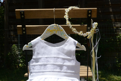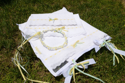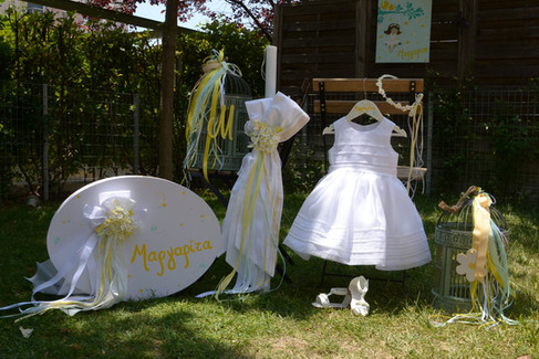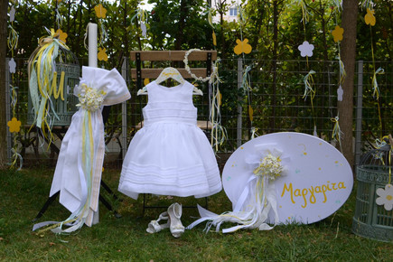 Ολοκληρωμένη βάπτιση για την μικρή Μαργαρίτα με θέμα τις μαργαρίτες 🌼🌼 Φορεματάκι από φίνα, ολόλευκη βαμβακερή οργαντίνα με έναν εντυπωσιακό φιόγκο και κουμπάκια στην πλάτη, συνδυάστηκε με οβάλ ζωγραφιστό κουτί και λαμπάδα βάπτισης διακοσμημένα με μπουκέτο από χειροποίητα λουλούδια και ασορτί στεφανάκι για τα μαλλιά. Τέλεια συνδυασμένα με τα λαδόπανα, τα παπούτσια, τα μαρτυρικά, το λαδοσέτ, τις μπομπονιέρες και τον καμβά! Όλα χειροποίητα στους τόνους της μέντας, του λευκού και του κίτρινου και διακοσμημένα με κορδέλες, μαργαρίτες και τρέσες!