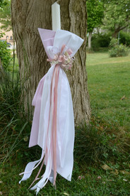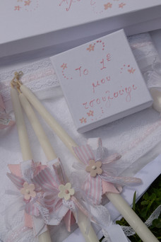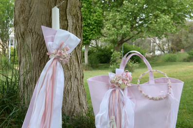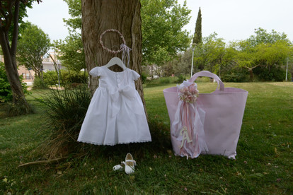 Ολοκληρωμένη βάπτιση για την μικρή Αλίκη με θέμα τα λευκά και ροζ τριαντάφυλλα. Βαπτιστικό φορεματάκι από λευκό βαμβακερό με σχέδιο στην ύφανση με δαντελένιο τελείωμα και εντυπωσιακό φιόγκο στην πλάτη με κουμπάκια. Συμπληρώθηκε με λευκές βαπτιστικές μπαλαρίνες με χειροποίητα λουλουδάκια. Συνδυάστηκε ροζ ριγέ τσάντα βάπτισης με ξύλινο μονόγραμμα και λαμπάδα διακοσμημένη με μπουκέτο από χειροποίητα 3d λουλούδια και ασορτί στεφανάκι για τα μαλλιά. Τέλεια συνδυασμένα με τα λαδόπανα, το λαδοσέτ και τα μαρτυρικά! Όλα χειροποίητα, στους τόνους του λευκού και του ροζ διακοσμημένα με κορδέλες και τρέσες!