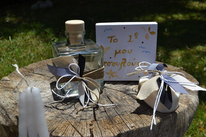 Ολοκληρωμένη βάπτιση για τον μικρό Παναγιώτη με θέμα τα λινά στο χρώμα της 'αμμου και του λευκού. Χειροποίητα ρούχα βάπτισης που αποτελούνται από λευκό λινό πουκάμισο με μαο γιακά και λινό παντελόνι στο χρώμα της άμμου. Συνδυάστηκαν με γιλέκο, φουλάρι και καπέλο σε μπεζ απόχρωση και blue navy εσπαντρίγιες. Συμπληρώθηκαν με κουτί βάπτισης ζωγραφισμένο στο χέρι με σχέδιο panda και το όνομα του παιδιού και λαμπάδα βάπτισης στολισμένη με ξύλινο διακοσμητικό μονόγραμμα. Ολοκληρώθηκαν με τα λαδόπανα, το λαδοσέτ και τα μαρτυρικά 'ολα στο ίδιο ύφος. Όλα χειροποίητα στους τόνους του λευκου, του μπεζ και του της 'αμμου διακοσμημένα με κορδέλες και τρέσες.