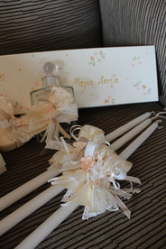 Ολοκληρωμένη βάπτιση για την μικρή Μαρία Λουϊζα με θέμα χρυσό, ιβουάρ και σομόν. Βαπτιστικό φορεματάκι από μεταξωτό σαντούκ ύφασμα, ένας εντυπωσιακός φιόγκος και κουμπάκια διακοσμούν τη πλάτη του φορέματος. Συνδυάστηκε με κομψό λευκό μπολερό. Συμπληρώθηκε με υφασμάτινο κουτί και λαμπάδα βάπτισης διακοσμημένα με μεγάλο φιόγκο και μπουκέτο από λουλούδια, όλα στο ίδιο ύφος διακοσμημένα με τρέσες και κορδέλες. Ολοκληρώθηκε με τα λαδόπανα, το λαδοσέτ, τα μαρτυρικά, τις βαπτιστικές μπαλαρίνες και το καπέλο για τα μαλλιά. Όλα χειροποίητα σε χρυσό, ιβουάρ και σομόν σε αποχρώσεις.